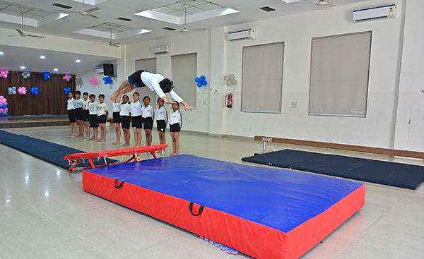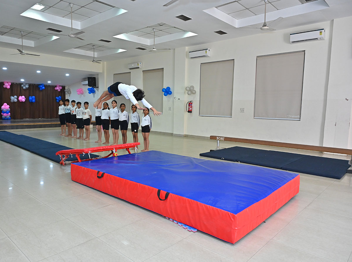 Agility of mind must be commensurate with the agility of body. The school believes in ‘Catching them young’ and promotes Gymnastics enthusiastically among all age groups from Primary to Senior school classes. Balancing Beam, Vaulting Table, Spring Board, Crash Mats, Trampoline, Landing Mats, Hula Hoop Rings etc help the students to master the art of balancing, mounting and dismounting and learn intricacies of various floor exercises.